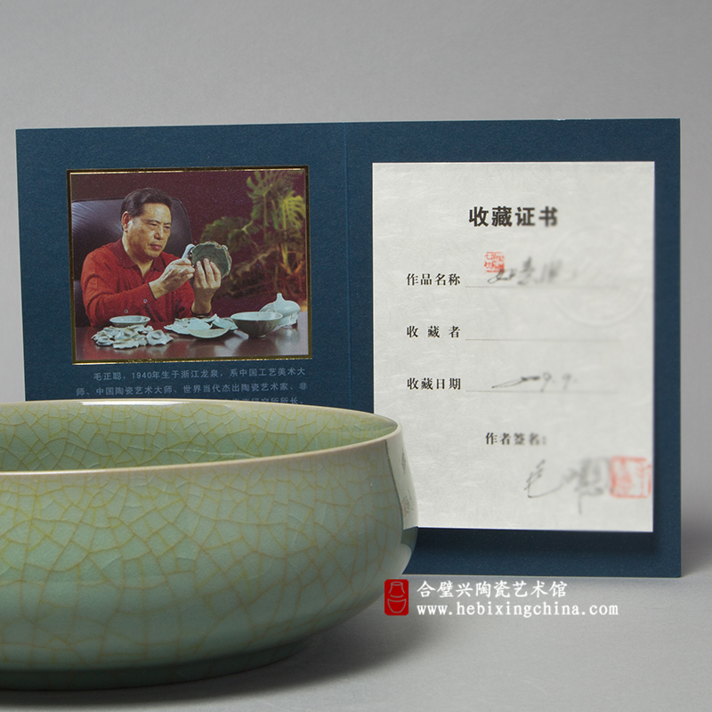 毛正聪从事青瓷艺术研究60多年,作品在继承传统工艺基础上大胆创新,造型简洁大方、典雅大气、釉层丰满,温润如玉。哥窑象形开片千奇百态,既象非象,别具一格,创当代青瓷最高境界。作为越系青瓷技艺史海钩沉的大家,毛正聪大师已致力恢复了仿官釉、鱼籽纹等多项失传技艺,为中国陶瓷事业继往开来做出了卓越贡献。