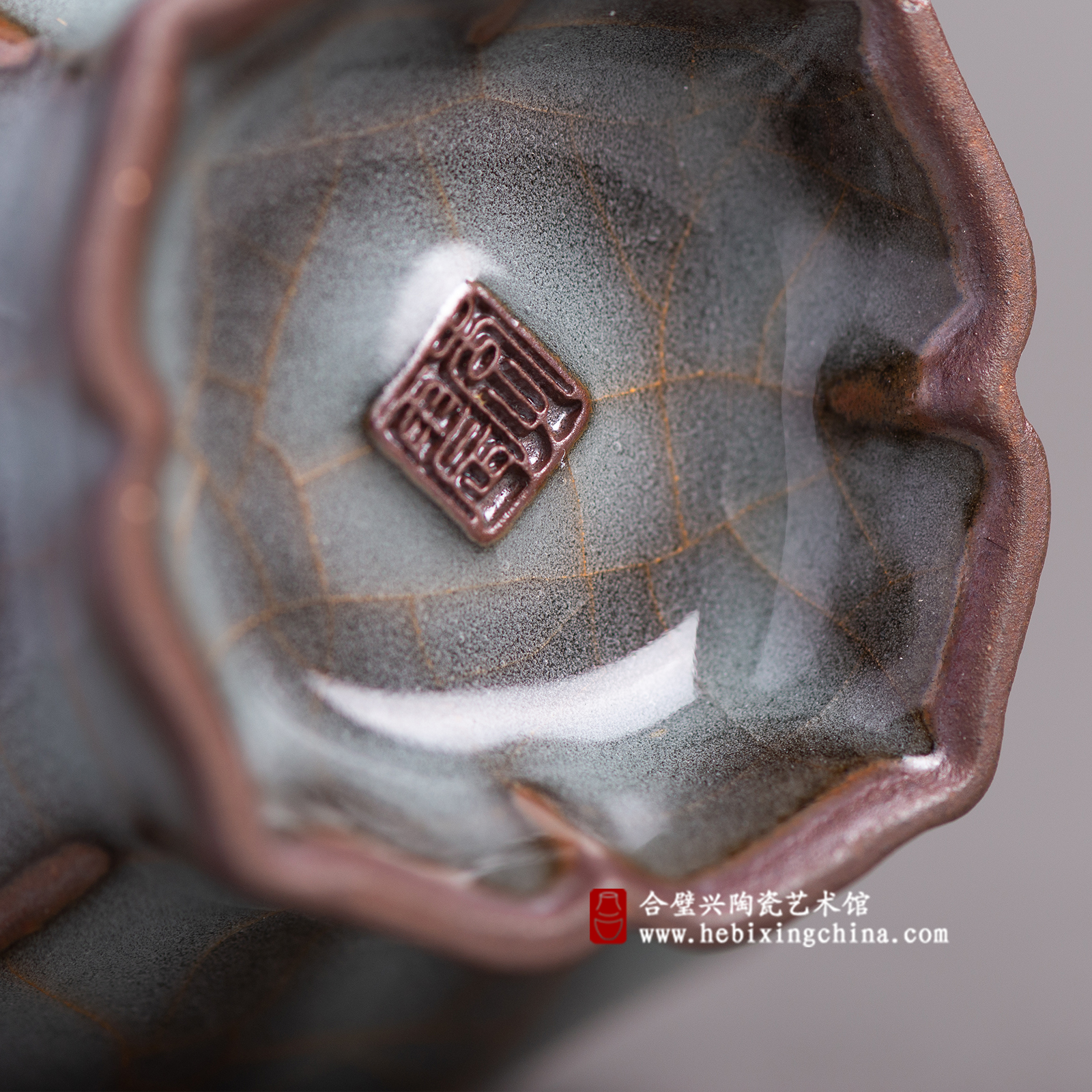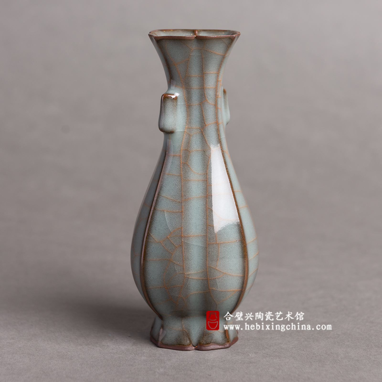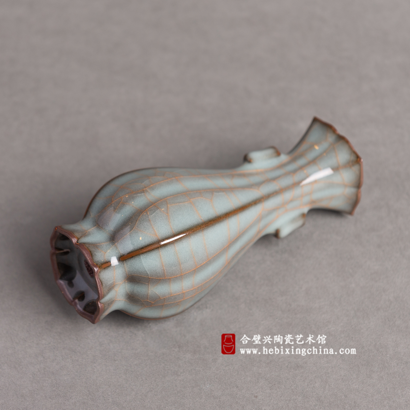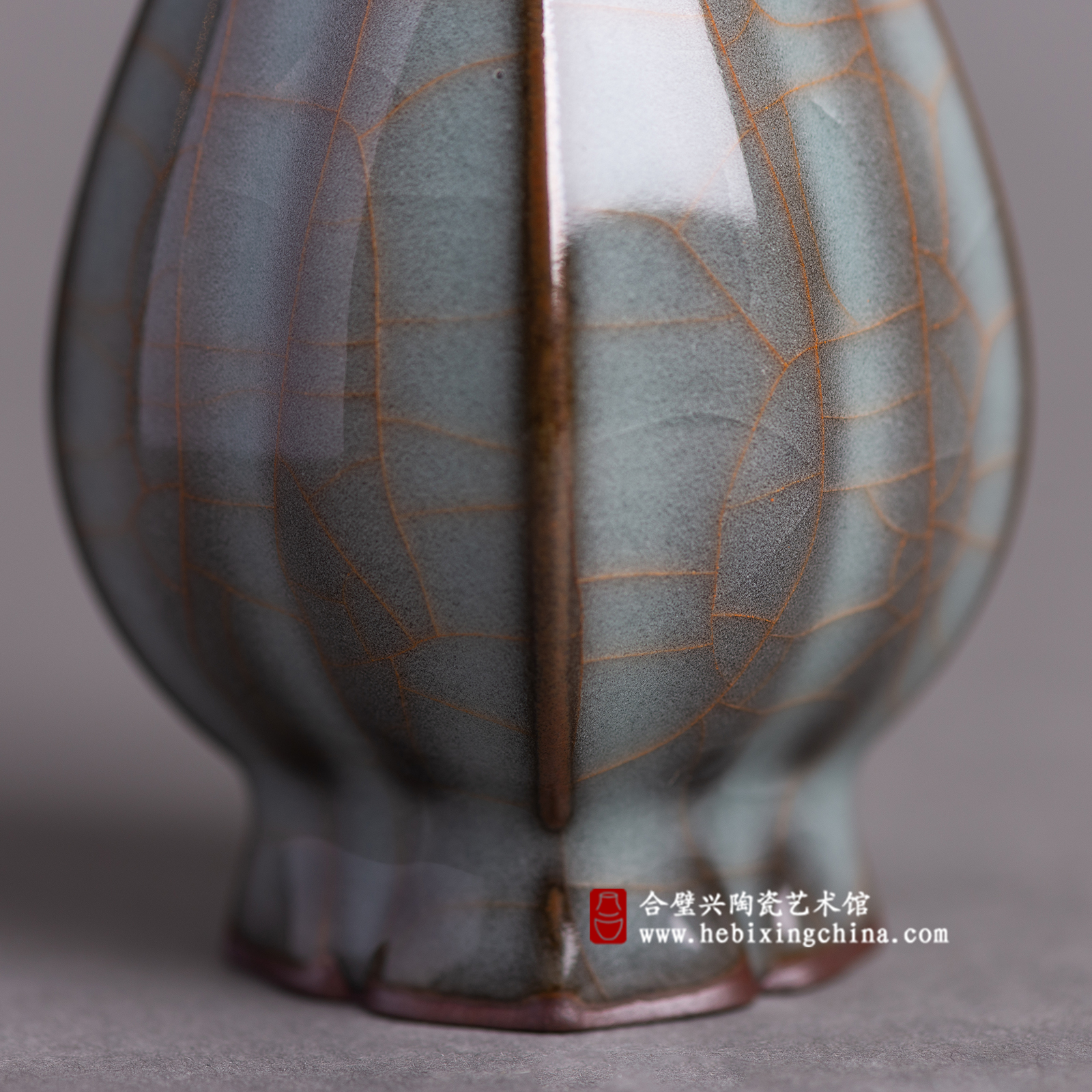 此件作品采用了海棠式瓶式宋代青瓷的经典形制,由口至足四道棱线将瓶体分成四瓣海棠花的形状。此件海棠瓶颈部还有一对精致贯耳,别致典雅,古韵天然。