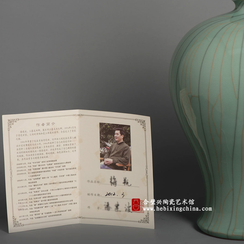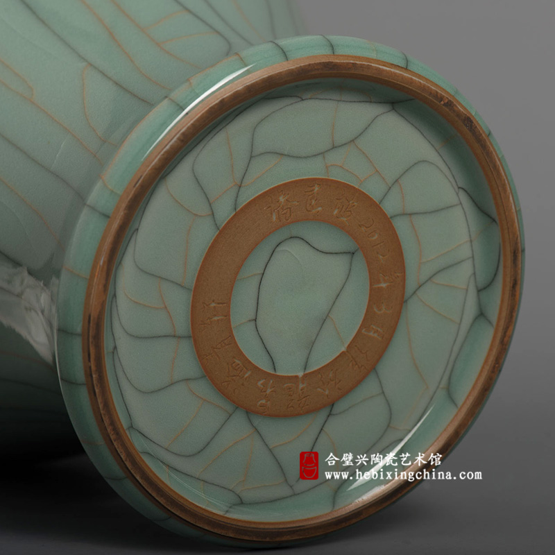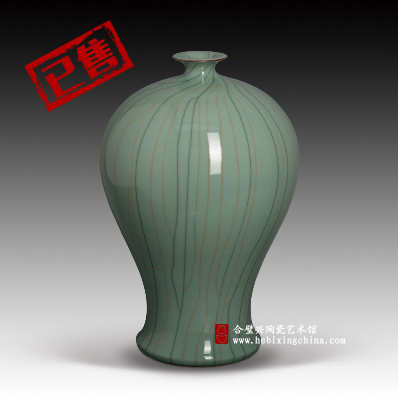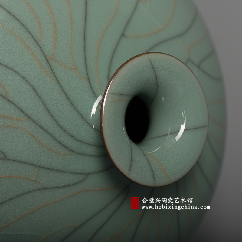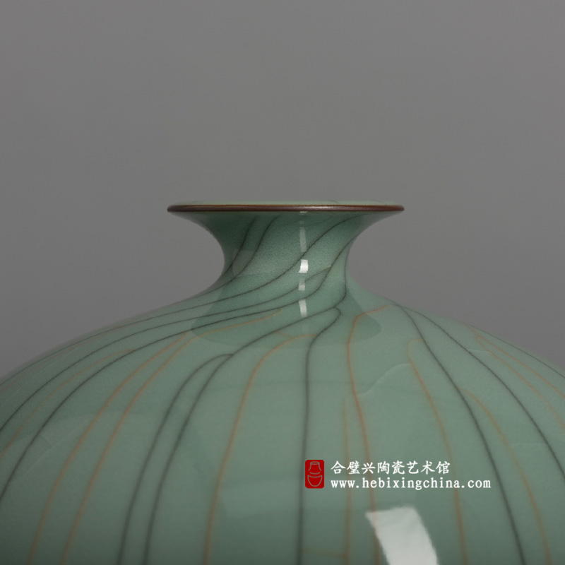 我们似乎能透过丰满圆润的肩部线条捕捉到一些明代梅瓶的神韵。底部的向外一撇俏皮又传神,彷如金红回廊里飘然而过的青衣佳人那飞扬的裙裾,轻轻巧巧的便被撩动了心弦上的一抹遐思。温雅的釉色里舒展的开片自瓶口沿着曲线优美的瓶身一路垂下,是佳人如瀑的青丝还是春日里柔婉的柳带?