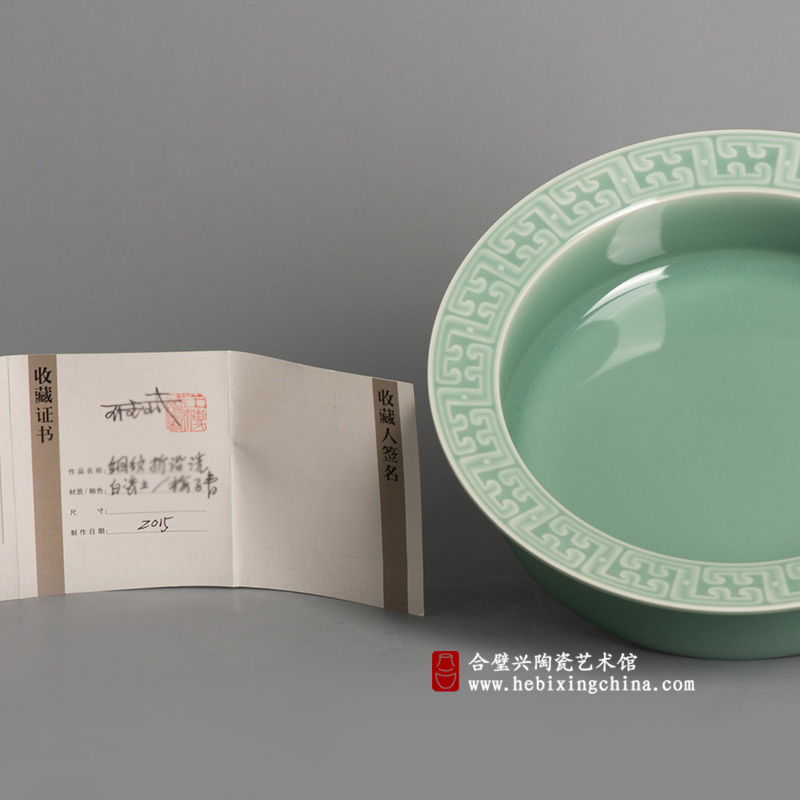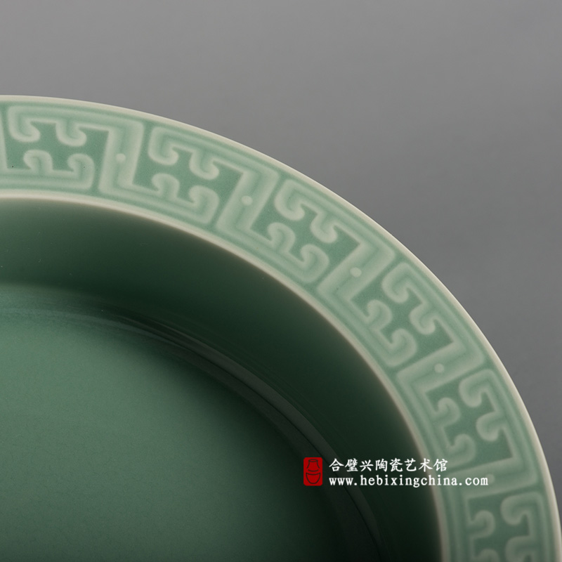 仿照秦汉青铜洗折沿直腹的造型,典雅中隐隐带着几分质朴与憨直,口沿上一圈颇具古风的精致回纹刻花,在翠润的梅子青中焕发出迷人的温柔气质。