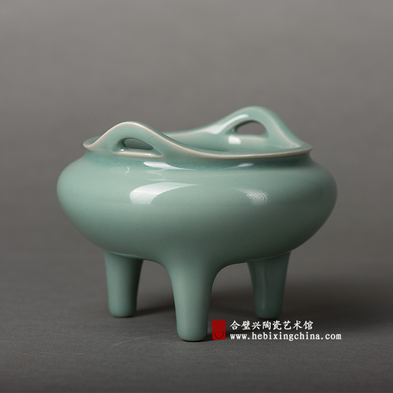 束口,肩部微微下溜,腹部扁圆,腹下三组,线条饱满灵动,唇上双耳与炉身浑然一体,镂空处两脚略略成尖,形似凤目,整体造型一气呵成,非常舒服。清雅的如玉梅子青釉如同刚刚沐浴了江南的春雨,清新而悦目,经典的形制被醉人的釉色染上了温润秀雅的气质。
