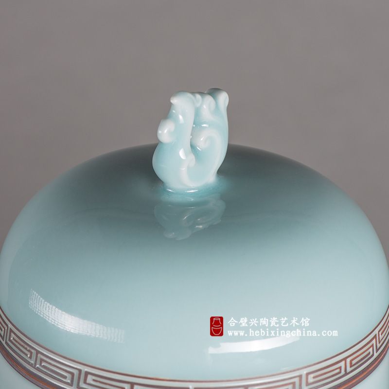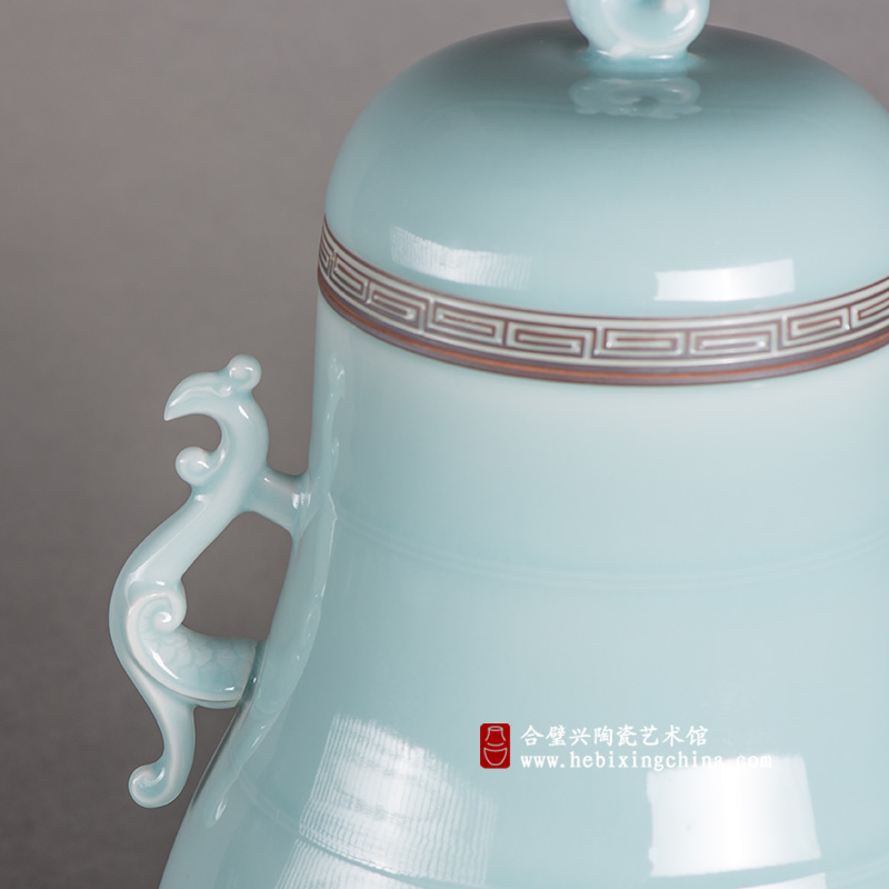 卢伟孙老师的粉青釉清雅明净总能让人从中感受到坦荡疏阔的君子之风。规整的紫色回纹装饰古朴雅致,仿佛一条精致的绢带把我们牵引回玉堂金门的汉代;优美的凤耳、玲珑的凰钮为我们缓缓打开了司马相如与卓文君那“凤飞翱翔兮,四海求凰”的千古传奇。