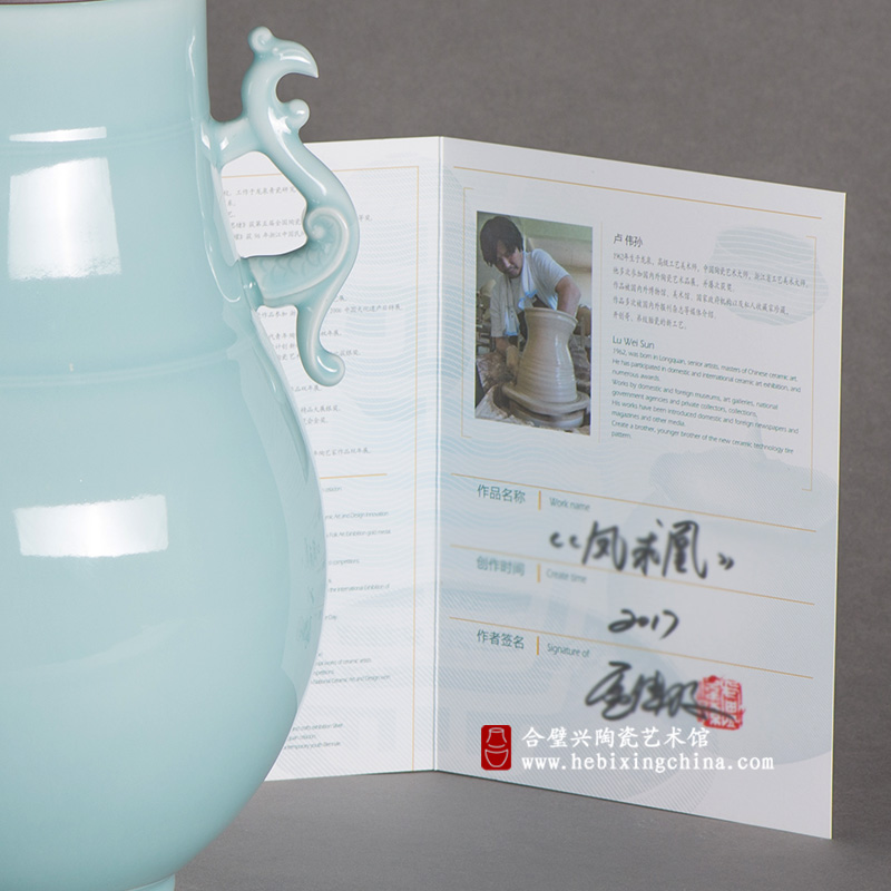 清润的釉把“凤求凰”这段才子佳人奔放而自由的爱情故事演绎出了别致的清雅味道,仿佛铮铮的琴声在我们耳畔萦绕;柔美的线条,典雅的造型更是让这段炽烈纯美的爱情增添上一抹典雅的东方神韵。