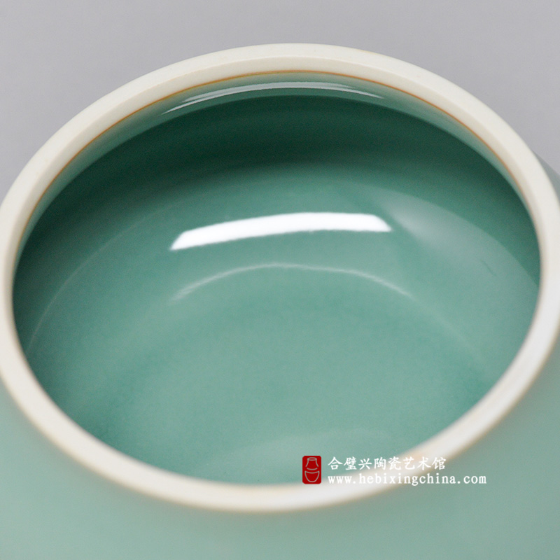 梅子青釉丰润如美玉,透彻似春水,釉面光洁柔腻似少女的肌肤散发出迷人的光泽。积釉和釉层中浅浅的蚯蚓走泥纹让沉静的青色有了变化与活力。整件作品便在纯美的青色中有了跃动的生机。