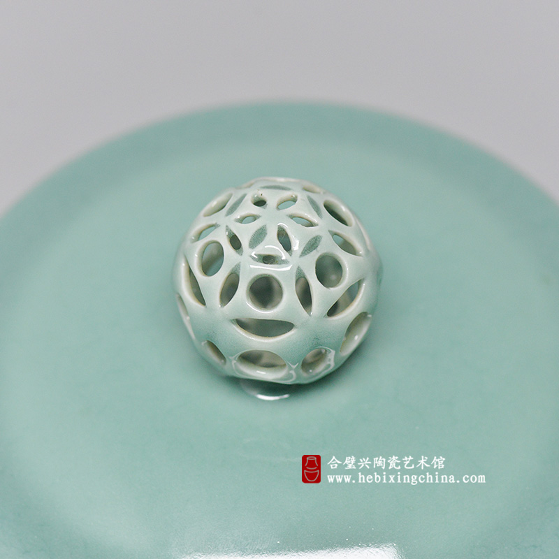 清润的梅子青釉色中盖顶镂空的玲珑球闪着翡翠般的温润光泽,一下就抓住了人们的目光。柔美优雅的曲线赋予了盖罐某种神性,让人再也移不开目光,在目光的流连中似乎可以通过这精美的瓷器触摸到上古的瑰丽神话。