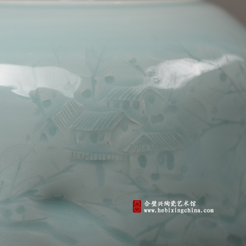 有别于传统器型的规整,这件作品的表面有着不规则的凹凸,盖钮也做随型处理,在造型上隐去了人工的痕迹,呈现出岩石一般浑然天成的质朴状态。把茅舍村树,山水田园刻入自然凹凸的表面,再覆上如青雾般清朗沁人的粉青釉色,清新质朴的田园风景带着山水诗词特有的隽永韵味迎面而来。