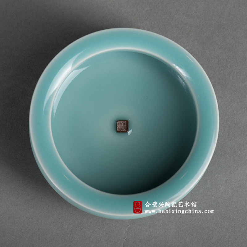 这是周华老师的一件青瓷小品,清润的釉色让圆润的小香炉显得更加丰润可人。口唇上的一圈积釉薄厚适中,既体现出青釉丰润如玉的美感又不会因为过于厚实而失了轻灵。釉面细腻清润光亮如镜,炉内中心处周华老师的紫色款识在莹润的青釉中显得格外精致。