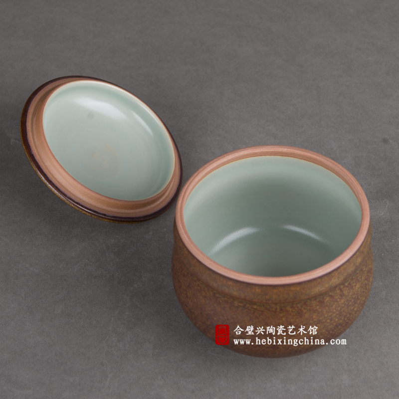 打开盖子,一色的淡青映入眼底,外壁草木灰釉和跳刀纹呈现出的略显粗粝的质感让内里清朗细腻的青釉成为了一道更加靓丽的风景,让人的目光随之一亮。