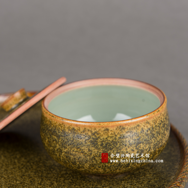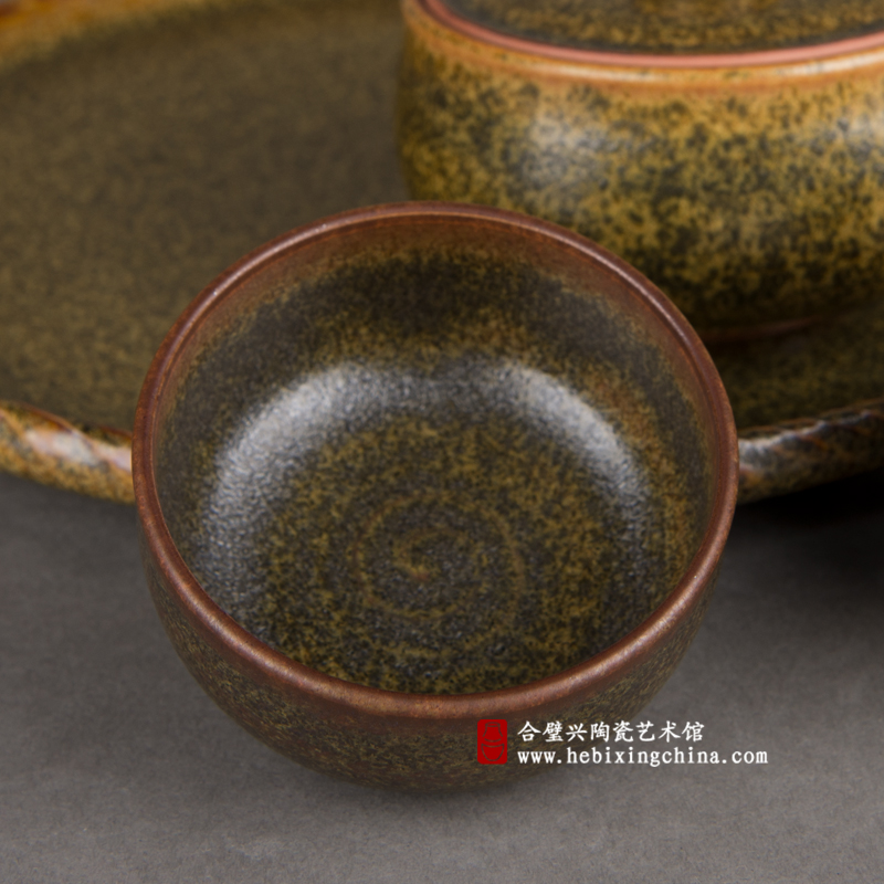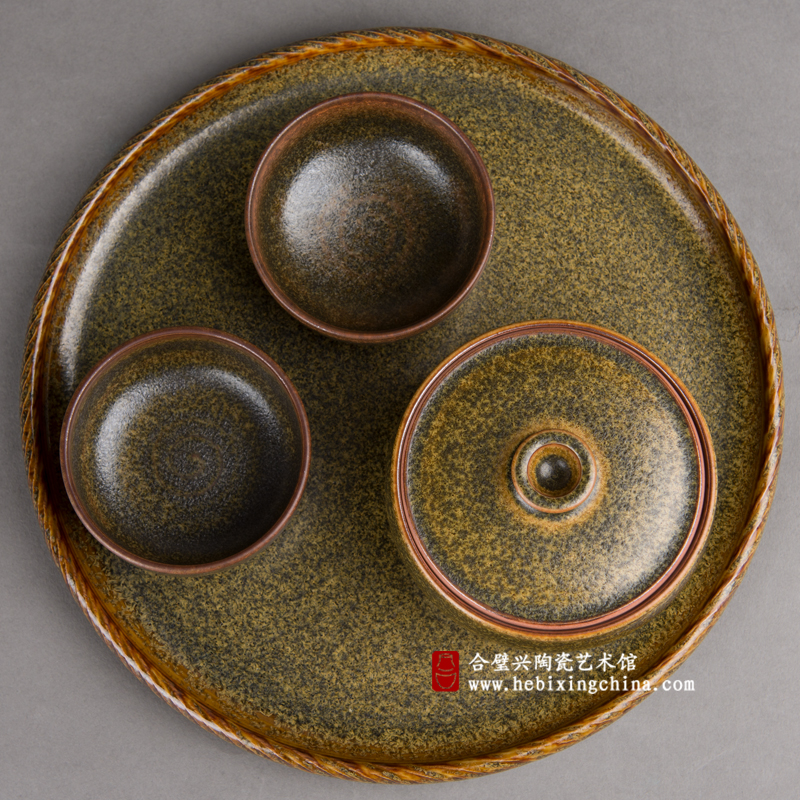 彷如竹编的跳刀纹路镶嵌在托盘周围,极富生活气息。而盖罐中细润的梅子青釉更是如褐色土地上的一泓清泉,明澈动人,瞬间点亮了整套茶器。