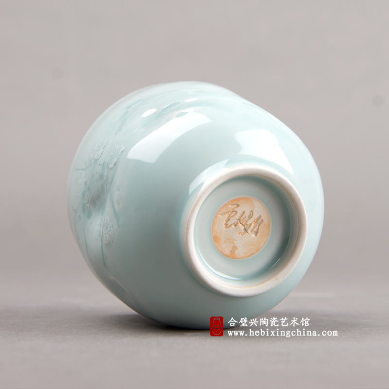 这一次卢伟孙老师却用独具个性的装饰手法和潇洒传神的刀工把登梅的喜鹊嵌入到山水画的清幽意境中,用明朗典雅的粉青釉色洗祛了俗艳的色彩,为喜鹊登梅这个传统的题材注入了清新文雅的新气息。典雅而喜庆,吉祥而潇洒的独特气质让这件作品成为了茶桌上的君子,书案上的宠儿,为静雅的生活再填一抹欢动的喜悦。