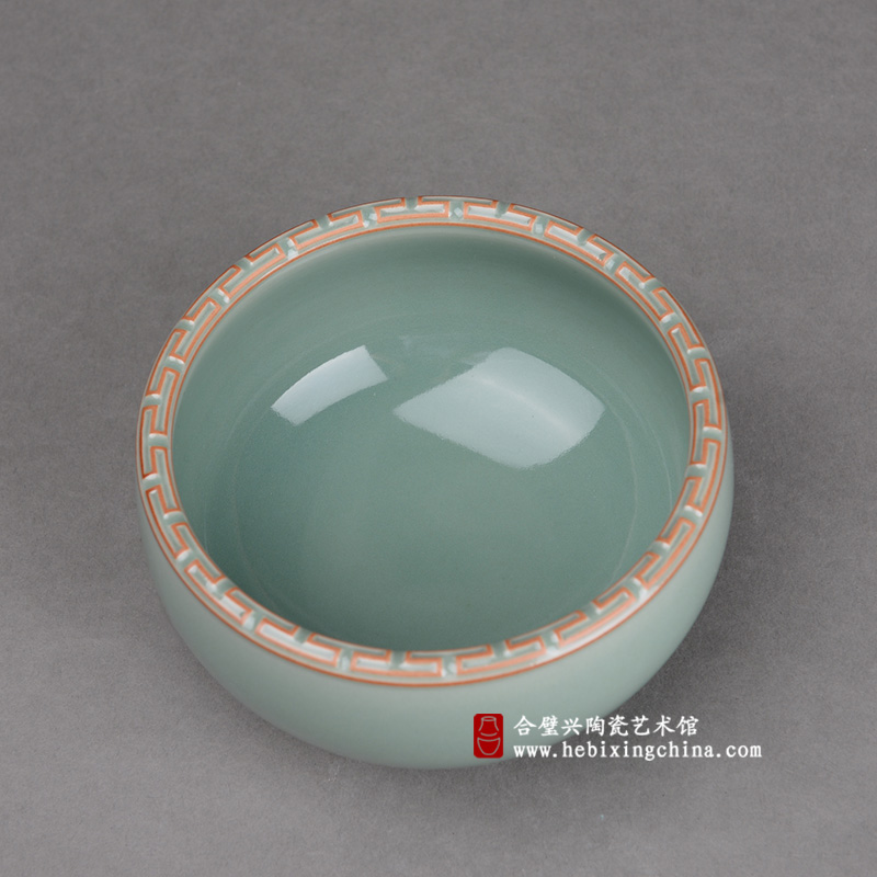 饱满圆润的口唇上,一圈朱砂土回纹规整而优美,把瓷钵点化为一方清澈的古池,池水中倒映出古朴的回纹栏杆,静谧典雅的韵味浑然天成。