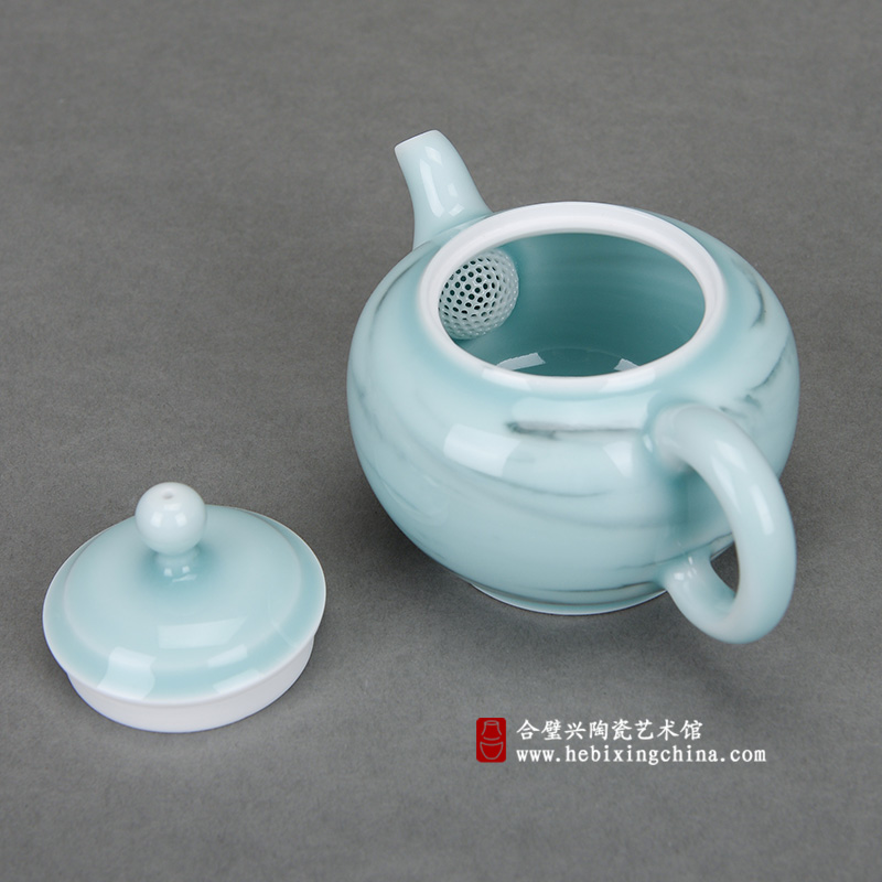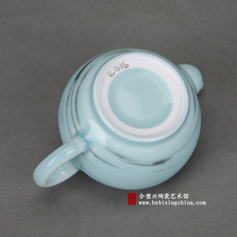 在丰润的粉青釉面中盘旋着绞胎形成的墨绿痕迹,自然舒展的线条像极了上好翡翠中天然浮现的纹路,时而不在表面,时而隐在其中,轻轻旋转壶身,那纹路又变成了点入清池的翠墨随着水波晕散出的美丽涟漪,虚实变化中蕴含着自然的玄妙和水墨画般的潇洒情韵,让人忍不住想将它捧在手中细细赏玩。