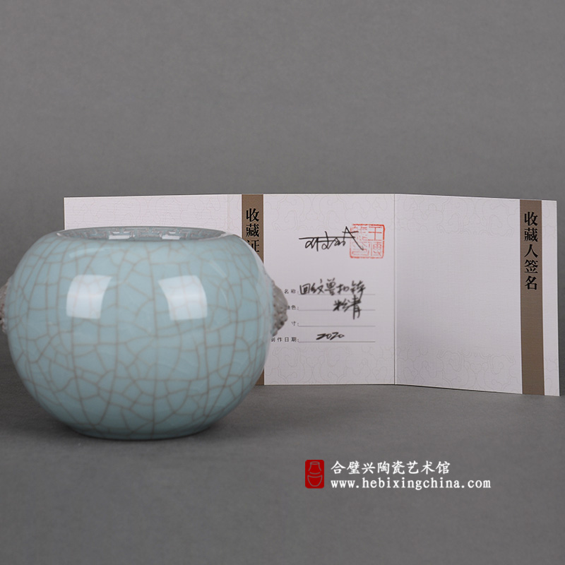王传斌老师将张扬威武的兽耳简化成精巧的兽扣,狮子造型丰眉环眼,宽鼻阔口威严依旧却没有了传统兽耳的张扬,与青瓷的温雅气质结合的愈发浑然天成。