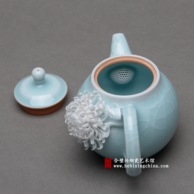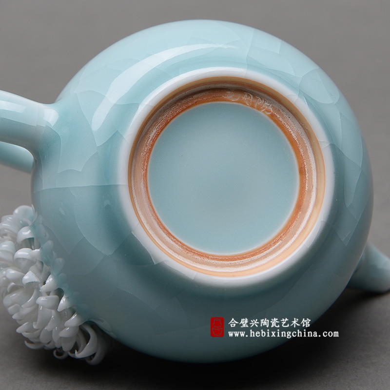 引着我们也从化作菊茎的壶柄,雕成花蕾的盖钮和壶嘴处隐在釉层的小小菊叶中,品出些许“采菊东篱下,悠然见南山的自在洒脱。
