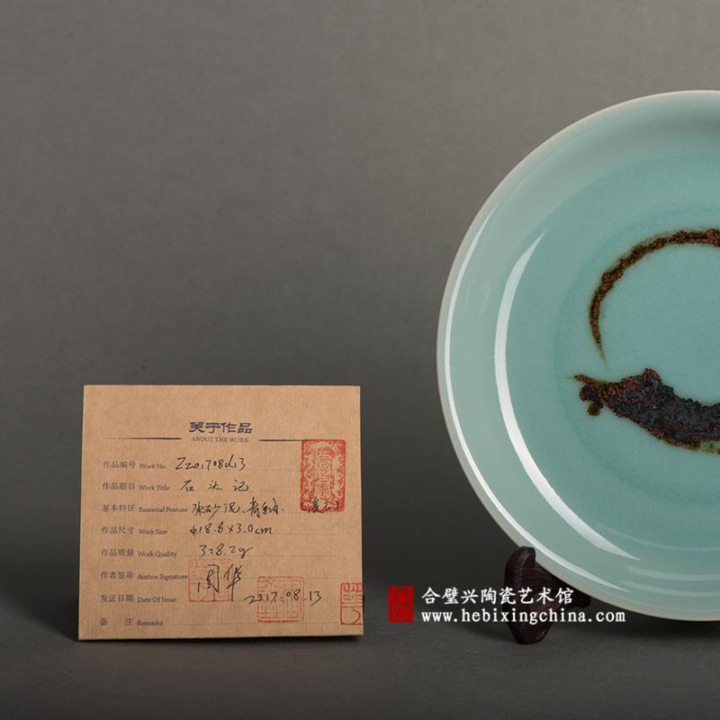 周华老师别具匠心的把身边极具自然气息的元素加入到他的青瓷创作中,以青瓷为纸,石泥为墨,用水墨写意的笔触在青瓷盘上描绘出一幅潇洒而神奇的《石头记》。