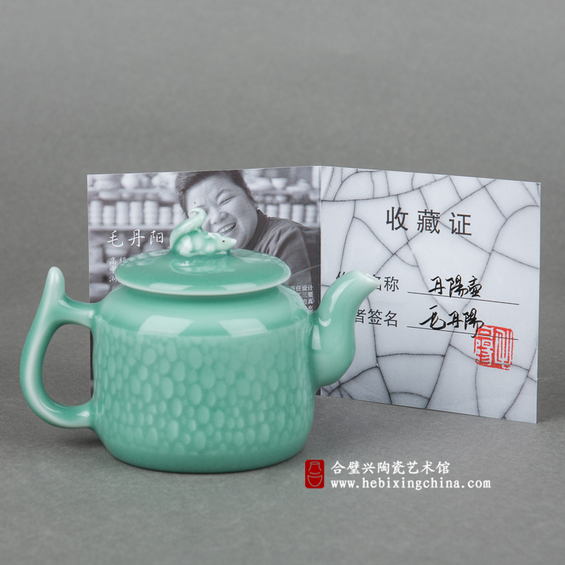 匀称的比例,流畅的线条构成了一把精巧可人的小壶。丰腴而清澈的梅子青釉把小壶装点的如春雨滋润过的翡翠一般清新养眼。