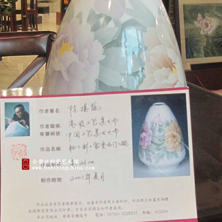 2006年《牡丹杯》、《牡丹笔筒》、《牡丹花插》,56cm《国色天香》瓶,42cm《春色满园》被国务院收藏且陈列