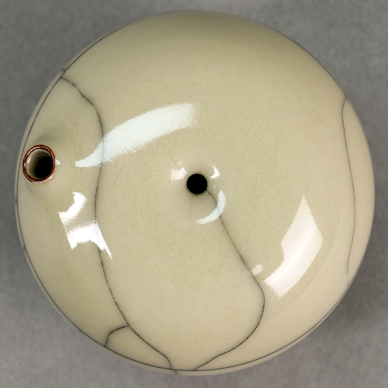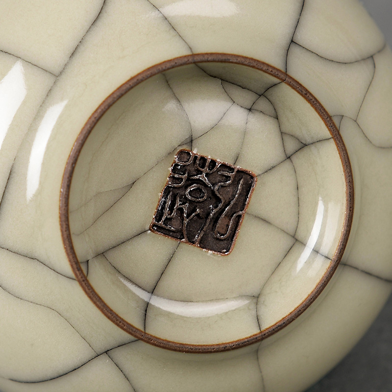 张绍斌出生于浙江龙泉一个陶瓷世家,作品采用纯手工拉坯成型,从宁静平和心态中生发出悟性灵感,融入手工拉坯,使每件造型独具神韵,而涅泥拉坯手法与构思造型的自然契合,也使作品在开片纹路上各呈风格。多年来,对梅子青、粉青、天青、米黄色哥窑等进行了深入系统的研究,使青瓷釉色得到明显改观,尤其是薄胎厚釉、支钉架烧研制成功,圆满恢复了传统官窑青瓷的烧制工艺,成为瓷中精品,被誉为当代官窑。观张绍斌的青瓷艺术,清纯洗练,温润凝神,既印证着大千自然的本真淳朴,又透溢出人文历史的情怀内涵,正所谓“空谷清音”、“会意传神”。