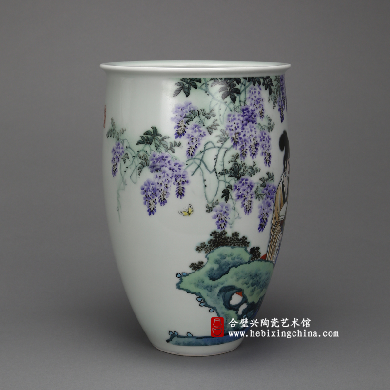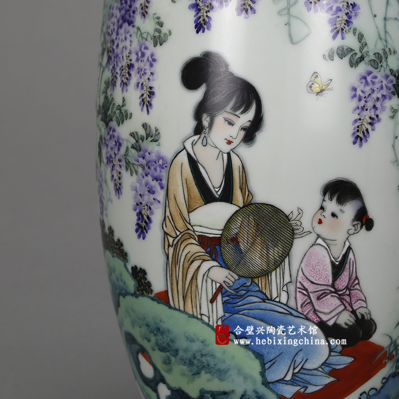 纷飞的彩蝶与花荫里的侍女与稚童共同组成了一幅赏心悦目的春光图。戴荣华老师充分发挥了粉彩瓷色彩柔和层次丰富的特变,把春光里的景与人描绘的异常可爱。