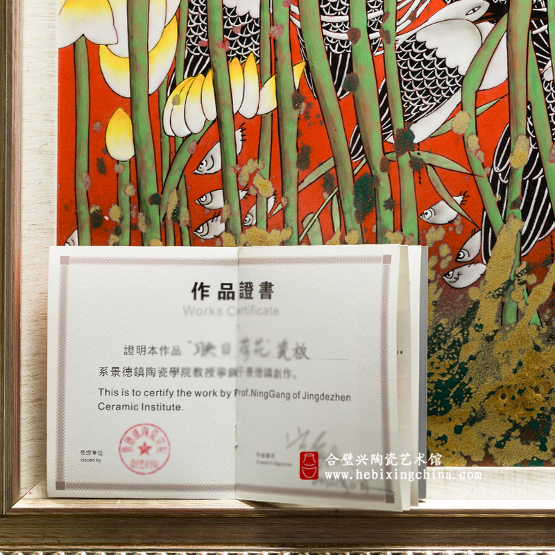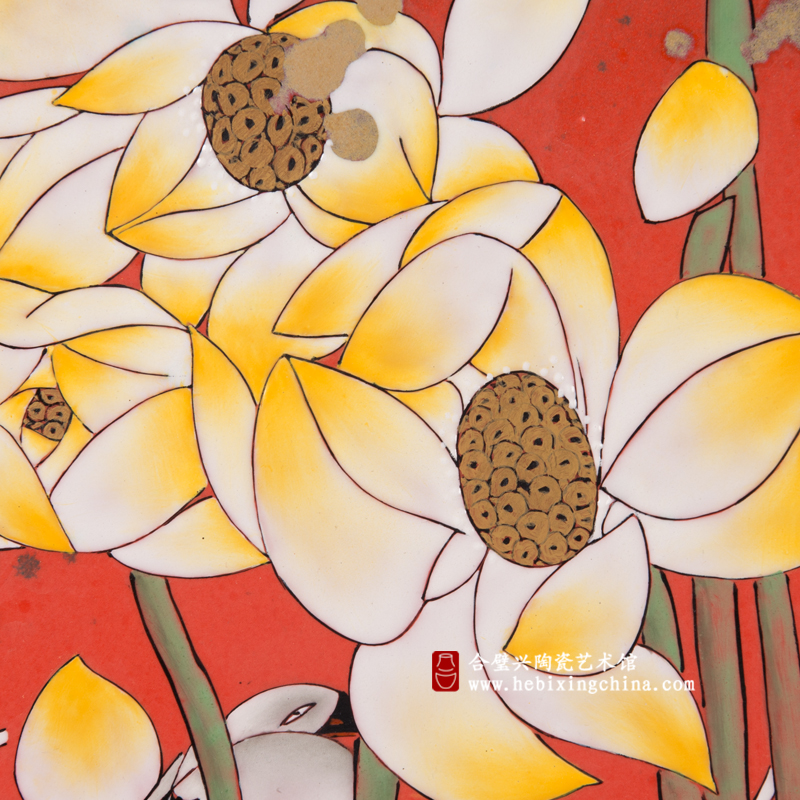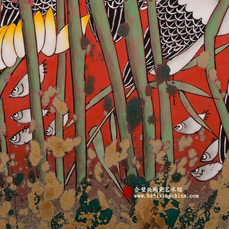 宁钢教授非常巧妙的用红色的背景和黄色的荷花营造出了金色阳光洒满荷塘的光影感觉,成群的鹭鸶,欢快的鱼群为画面增添了蓬勃的生气,而底部的窑变效果则是为画面增添了丰富的质感和层次感。整幅作品把静谧与奔放两种气质融合在一起,让人仿佛也置身于金色的阳光中感受到满满的暖意。