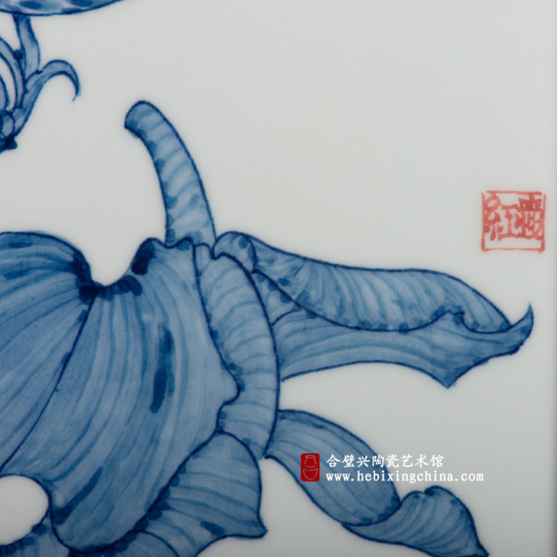 实际上以纯净的青花采用分水的方法绘制,仅使用极少的彩色点染,使画面极为纯净靓丽,富有一种单纯清静之美。