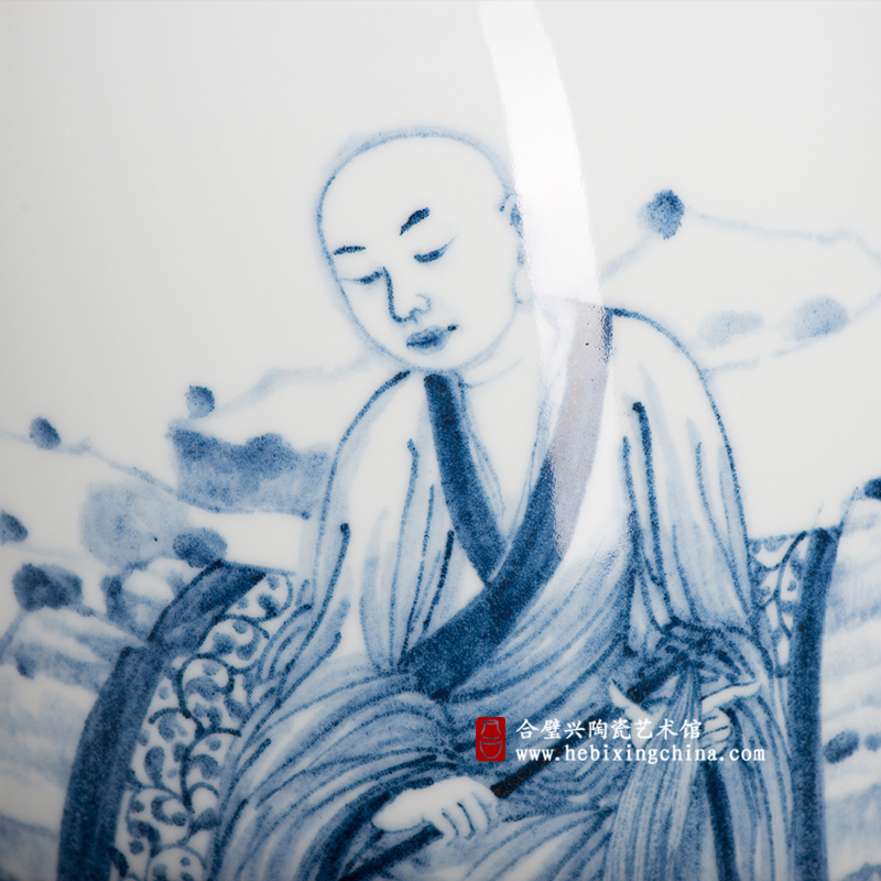 作品让不染六尘的僧人与石为伴,自然营造出空明中蕴含哲思的意境,青花的运用更是加强了作品舒朗冲淡的气场。年轻僧人手持拂尘安坐石上,透过微垂的双目,我们似乎能窥见些许他内心中“我”与“石”的思考。