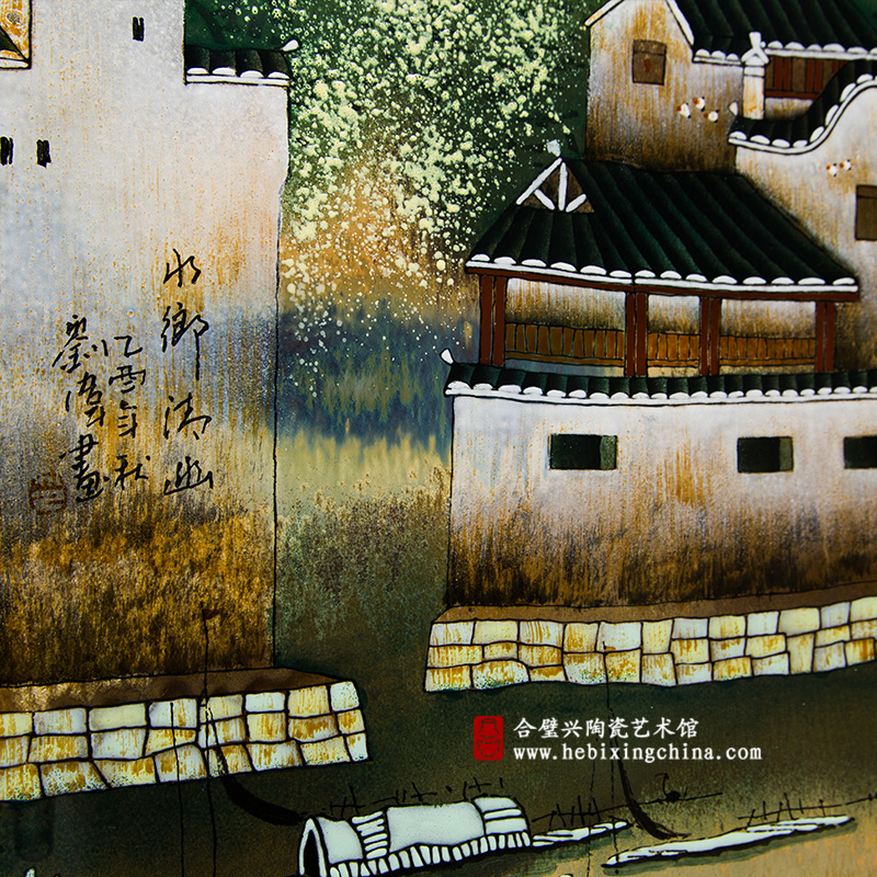 釉料经过高温烧制所产生的窑变纹理将水中的倒影和天上的霞光都描绘的惟妙惟肖,悦目的蓝色带着清晨微凉的空气催开了满树的繁花,温柔的橘红便是落日为天空染上的绚丽霞光,给青瓦白墙的水乡村庄带来暖暖的乡情。