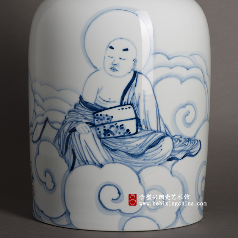 青花丰富的表现力把素淡典雅颇具禅意的意境塑造的无比熨帖,同时也赋予了画面丰富的层次感。漫卷的祥云层层叠叠,将罗汉环绕其中,巧妙的留白更是营造出无限深远的空间感,让意境更显空灵。