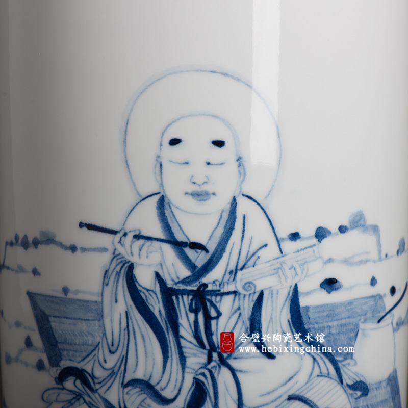 再用简单的线条和素淡的青花加强“禅”的意象,作品中自然的生出禅意来,禅意中“不可语说”的意境便也直入人心了。