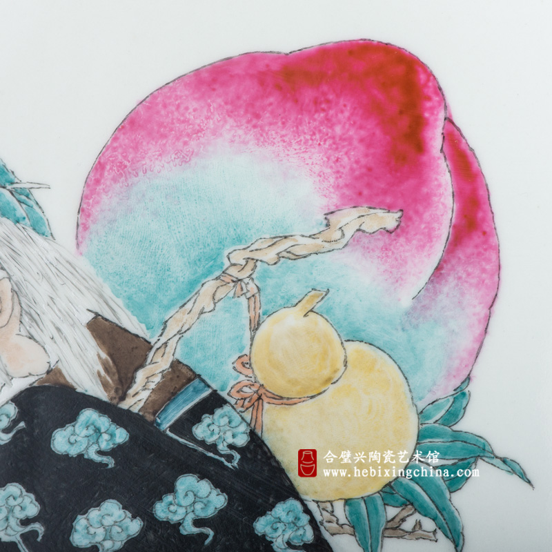 鹤发童颜的长者手持藤杖徐徐而来,背后一颗圆润的硕大仙桃娇艳欲滴,让人仿佛能闻到它散发出来的甜美味道,仙桃旁的酒葫芦随着老者的脚步摇晃,不知是盛了什么玉液琼浆,也散发出阵阵香气,一只红色的蝙蝠不知是被仙桃的香气吸引。