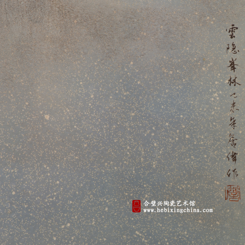 在高温颜色釉的背景上以丰富多变的细腻笔法勾画出嶙峋的山石和苍劲的古松,山中云气缭绕,将几处俊秀挺拔山峰巧妙的形成了一个整体。
