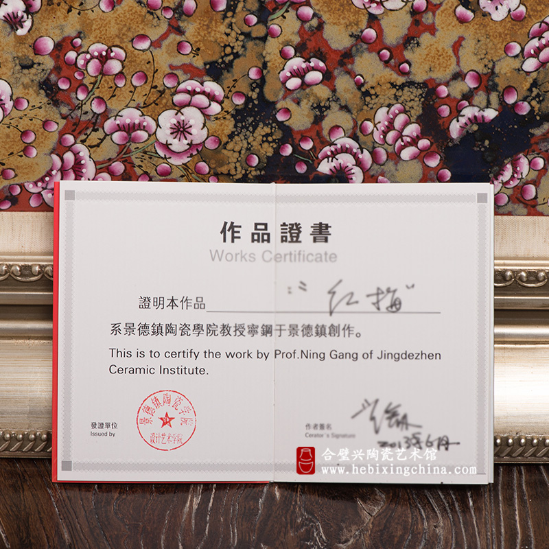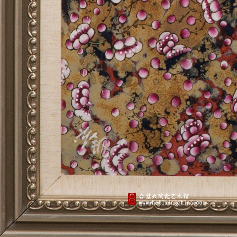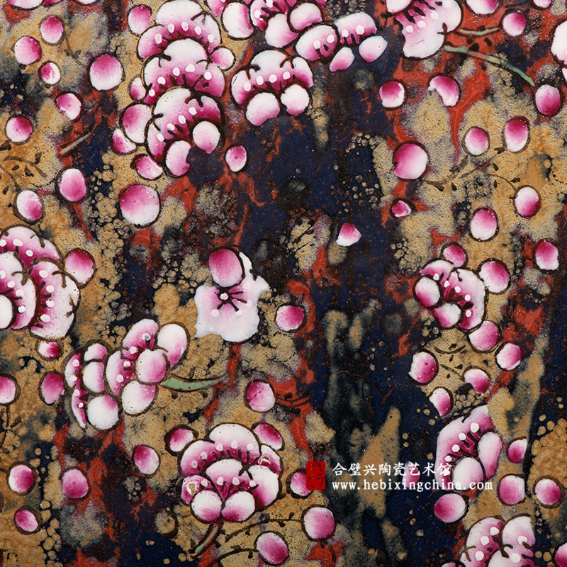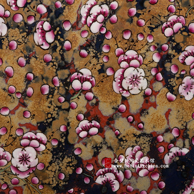 窑变和粉彩的不同质感让作品呈现出一种别样的魅力,伸手触摸,窑变的粗砺变化和粉彩的细腻光洁让你用指尖也能体会到红梅的浪漫与奔放。