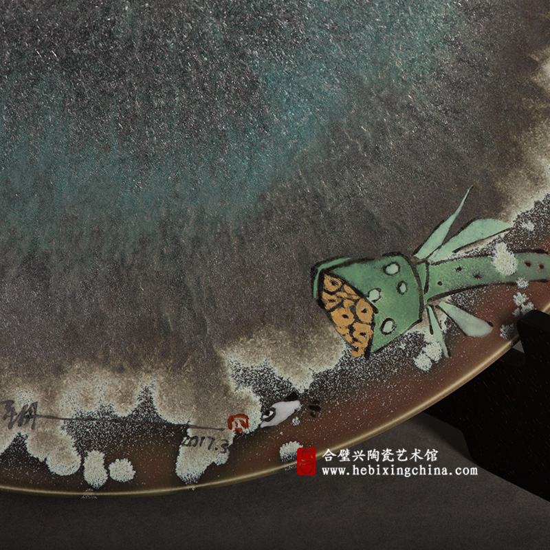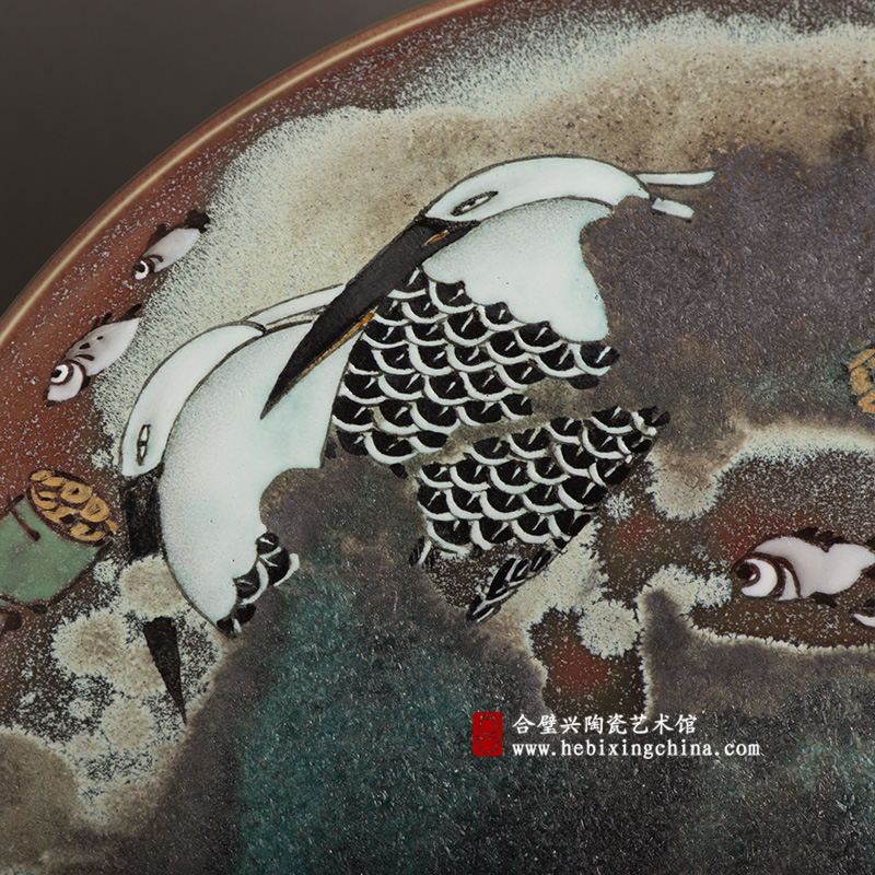 作者把白鹭、小鱼与荷花的形象十分巧妙的隐藏在窑变形成的抽象纹理中,营造出犹抱琵琶半遮面的婉约美感,并通过这有趣的构图激发出观者不断探究的好奇心。