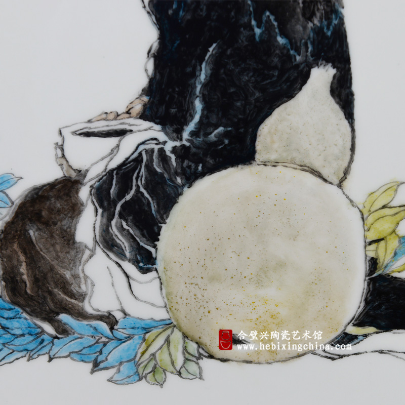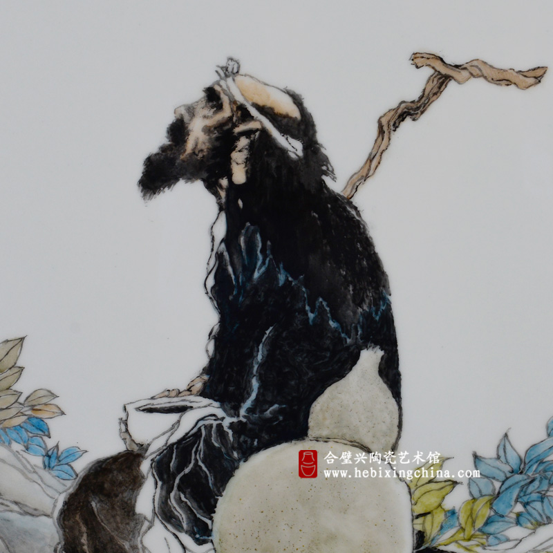 铁拐李席地而坐,双手捧着一只白瓷钵,仰头注视着树干顶端毛色鲜亮的小鸟,不同于之前的作品,此次李峻老师对人物的面部采用了较为写意的处理手法,没有细致的线条和眼神的刻画,但是从笔墨的点染中我们可以清晰的感受到铁拐李沧桑的面容和深邃的目光。