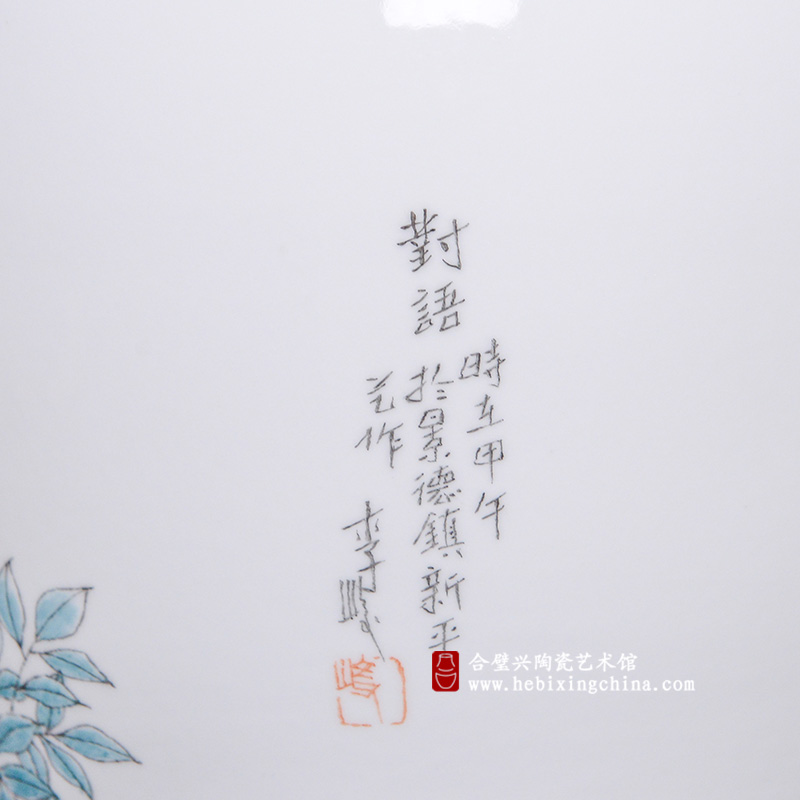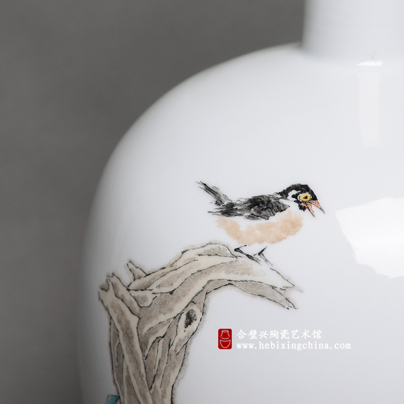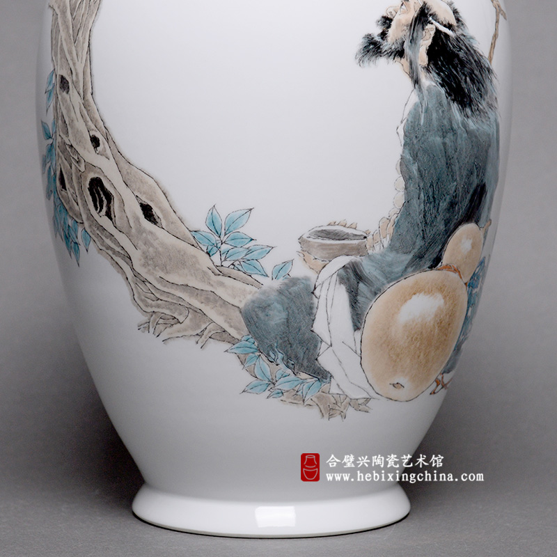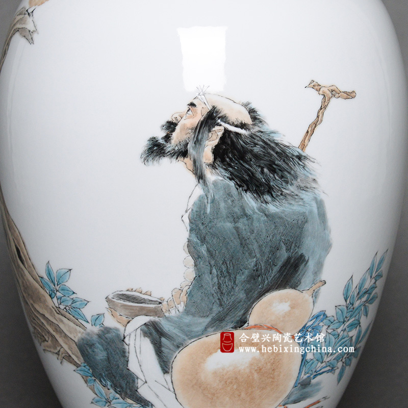 这一次,对语的画面被搬到了瓷瓶上,弯曲的树干宛若一道桥梁,沟通了枝头的鸟儿与席地而坐的仙人,披发的仙人背靠着葫芦,身体略倾下颌微抬的姿态,闲适中似乎还带着些许的渴切。