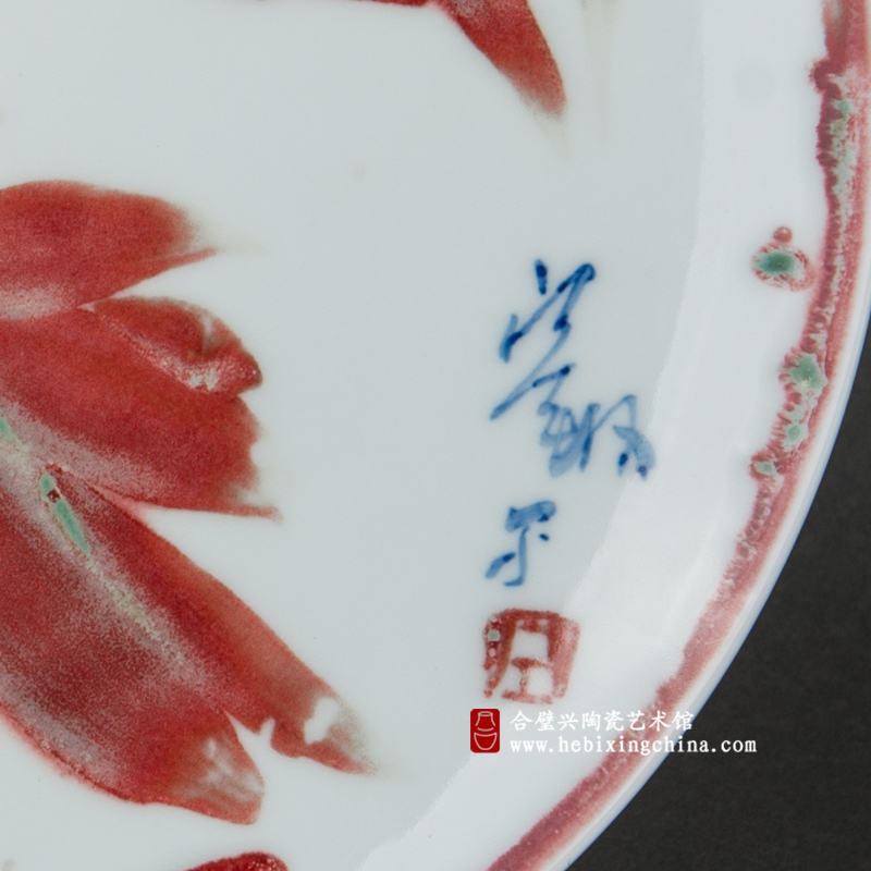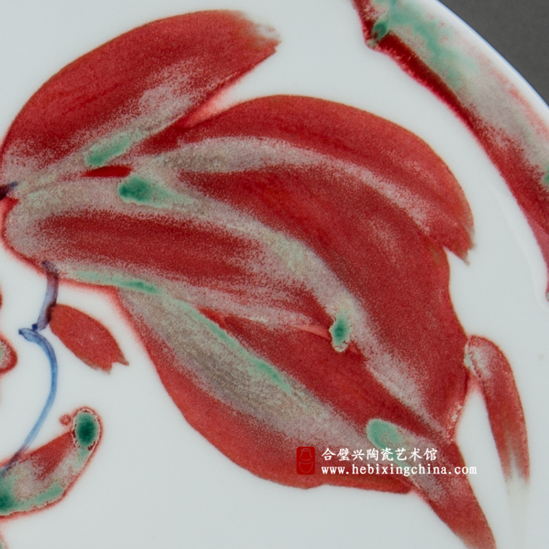 以色彩丰富又富于变化的釉里红来表现金鱼的缤纷色彩和鳞片的奇妙光感再恰切不过,红绿交融的色彩也把金玉满堂的主题诠释的不凡的神韵。