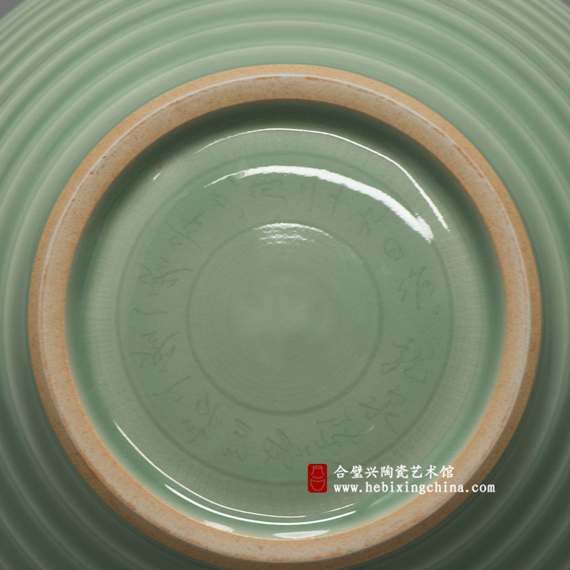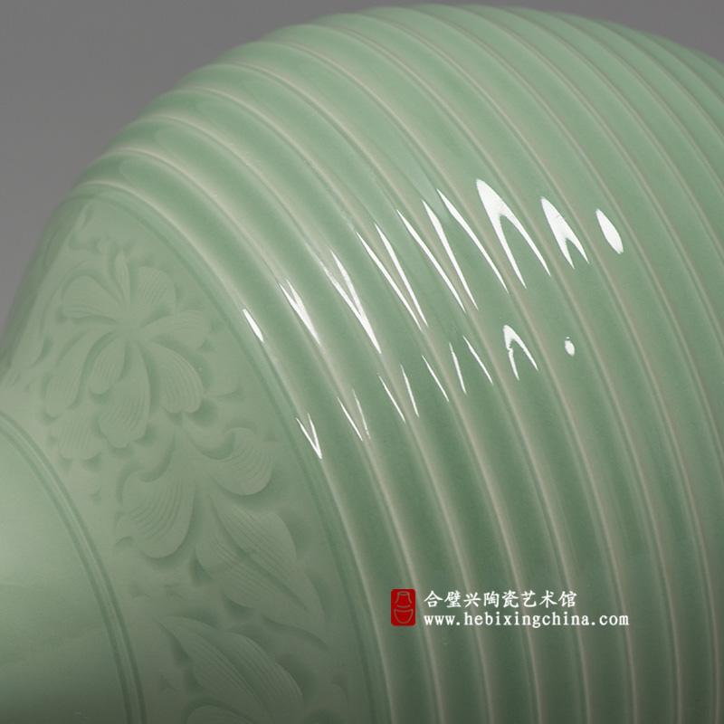 梅子青釉,牡丹纹饰,宽弦纹,都是龙泉青瓷的代表性符号,陈爱明老师用优美的青瓷语言把这些符号巧妙的连缀在一起,谱写出一段醉人的春天的旋律,一幅美丽的画卷随着这缓缓流淌的旋律在我们眼前徐徐展开。