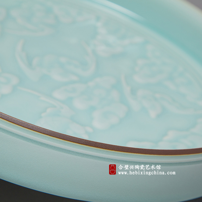 晴空般的纯净釉色让人眼前一亮,一圈醇厚的紫色更是把粉青釉色衬托明朗可人。洗内阳刻出祥云蝙蝠图案,刀法精到,造型生动。洗内五只蝙蝠在祥云间穿梭嬉戏,姿态只只不同,云朵造型圆润可喜与灵动的蝙蝠相应成趣。