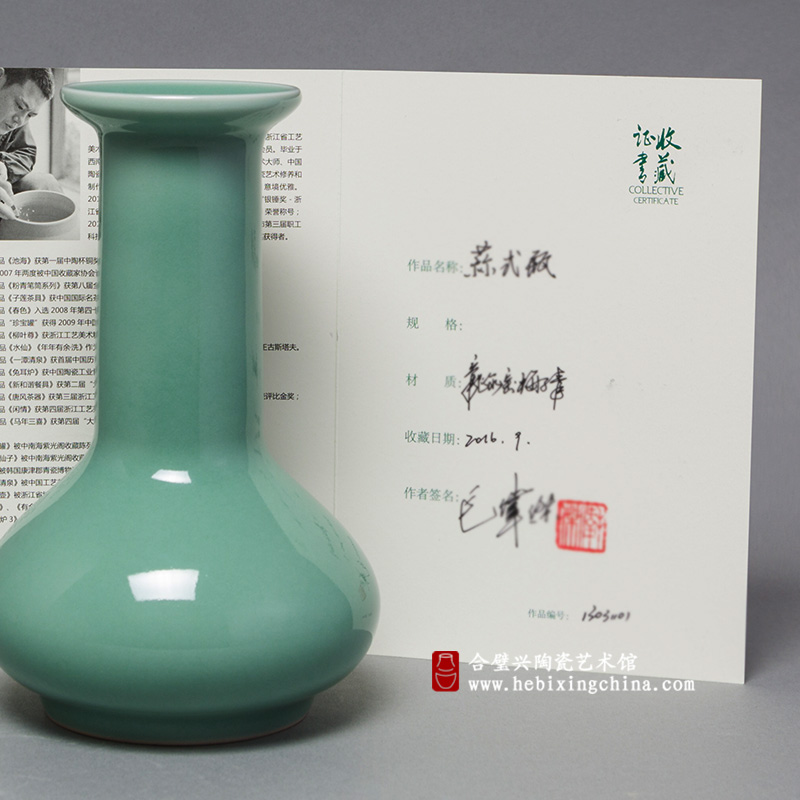 直而长的瓶颈与蒜形的垂腹如同矩形与三角形的巧妙连接,给传统的青瓷带入了几何的美感。