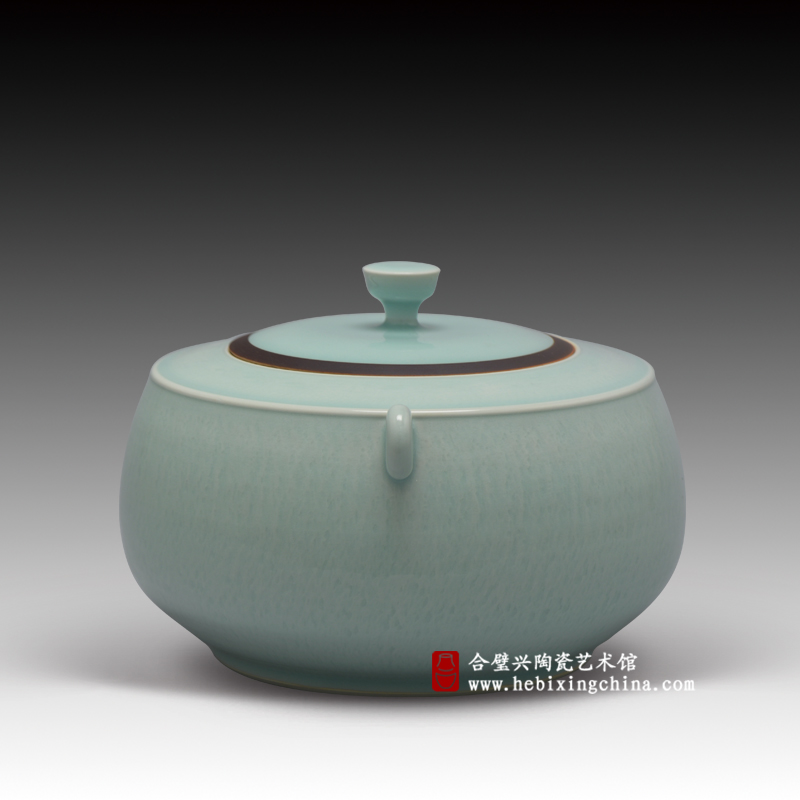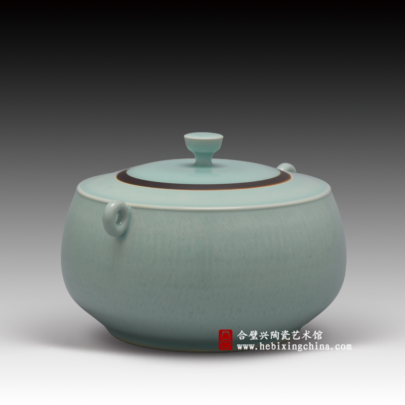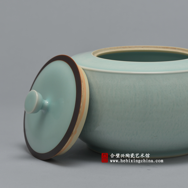 敦厚饱满的造型在清润的粉青釉色里显得愈发娇憨可人,整个盖罐清朗而简约,除了罐盖上的一圈紫金土和罐身两侧一对圆润如平安扣的玲珑小耳别无装饰。