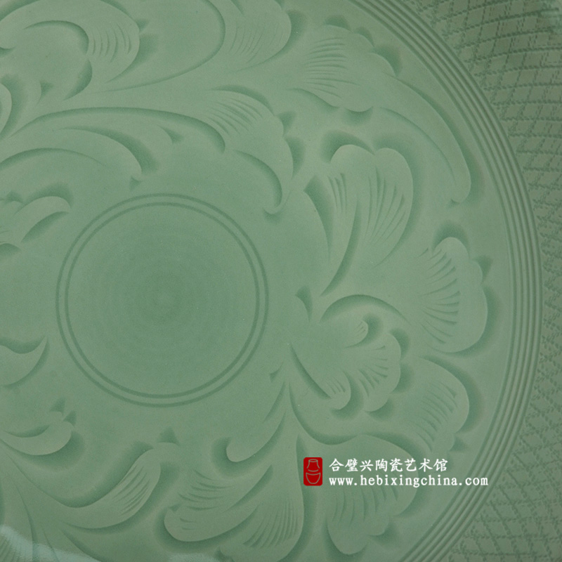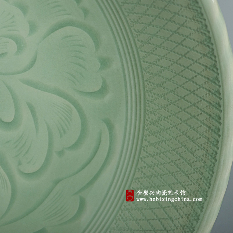 简单利落的线条,洗练而讲究的刀法,一朵盛开的牡丹便跃然盘上,潇洒俊逸中透出幽幽的古意,仿佛是千年前耀州窑的北地牡丹在龙泉的细雨中再次开放。