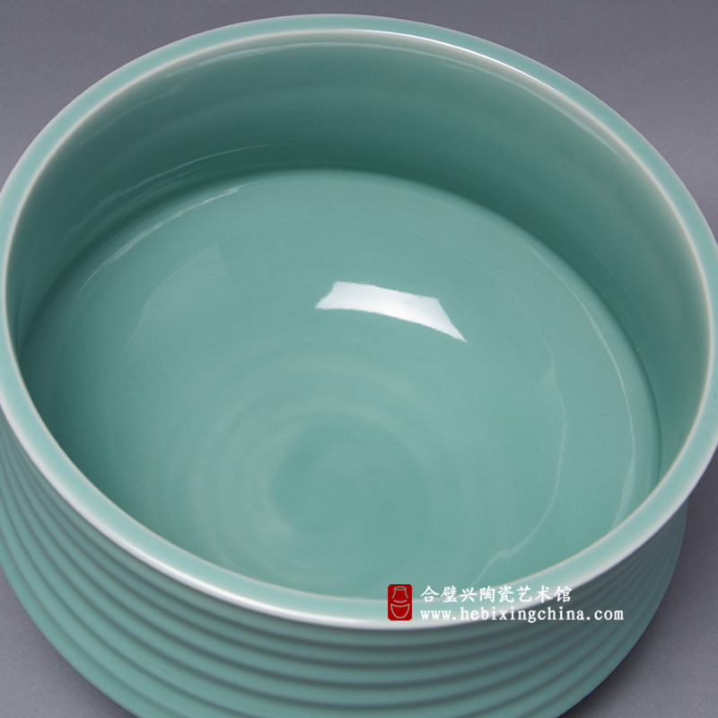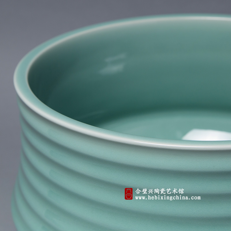 优美的弧线,规整而富于变化的弦纹,戏剧性十足的转着,共同营造出一种刚柔并济的迷人气质,而带着竹之清新与月之皎洁的粉青釉色更是在这独特气质中加入了温润如玉的君子气韵。