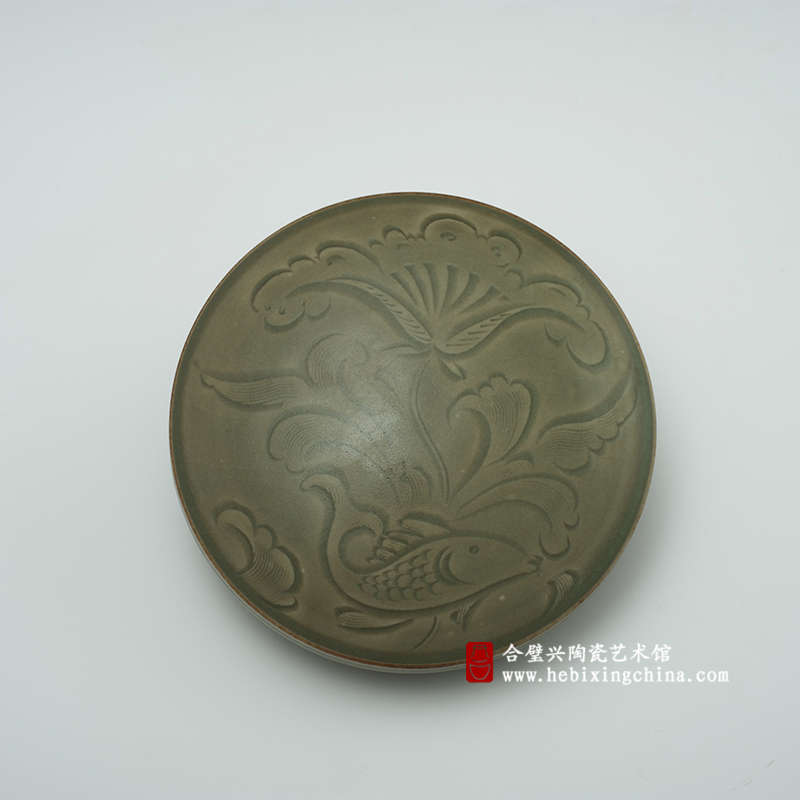 作品施以老青釉,盒盖上刻莲叶,游鱼,刀工老辣,图案生动写意,器型古朴典雅。
