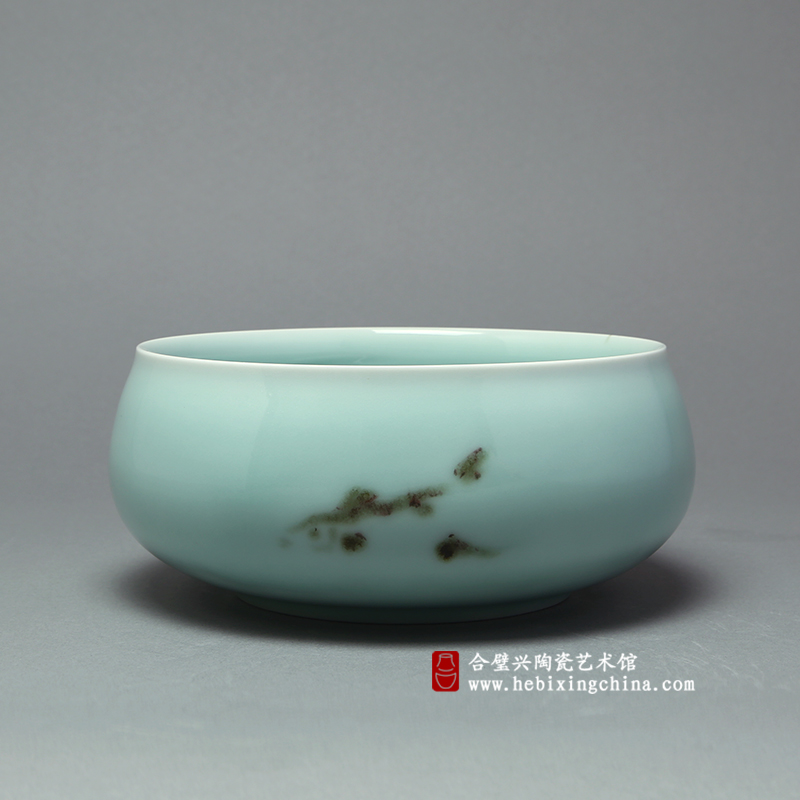 丰润粉青釉所呈现出的清朗静谧的感觉因为一尾点彩小鱼而充满了灵动的生机。洗内中央处手拉坯留下的一段痕迹是作品中的又一神来之笔,它像极了鱼儿游动带起的小小旋涡,既符合了“春波”之名,也点活了鱼翔清池的意境,引领着我们的神思沉浸到这片静谧而充满生机的青色世界中,尽情的享受青瓷带来的快乐。