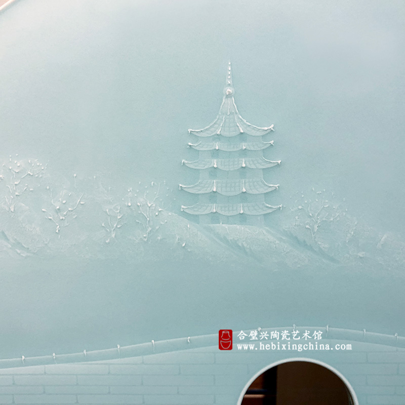 运用浅浮雕技法,于璧面上阳刻古塔垂柳、断桥湖水、莲花荷叶、戏水鸳鸯等图案。