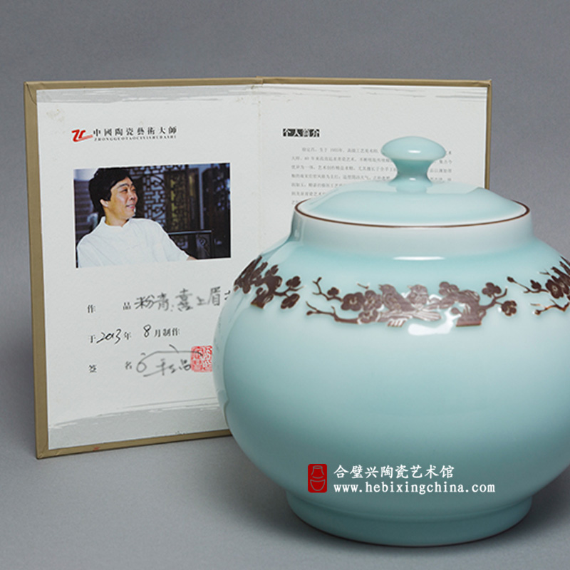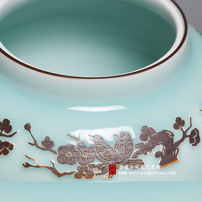 盛开的梅花引来灵动的喜鹊在梅树的枝头跳跃欢唱,徐定昌老师用醇厚的哥窑泥描画出这精巧的图案,将素雅的青瓷盖罐装点出一番别样的生动。