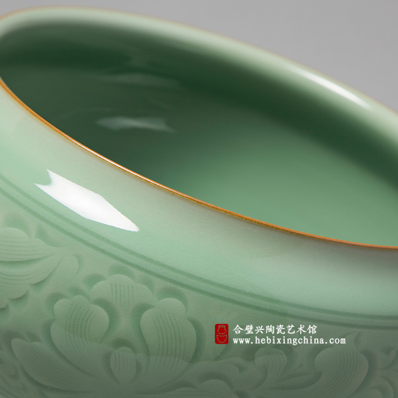 典雅细腻的梅子青釉中盛开着朵朵碧色牡丹,带着青瓷特有的温雅和大气古朴的韵味。牡丹在我国有着悠久的栽培历史,在千余年间牡丹被赋予了太多的精神内涵。