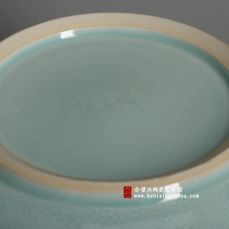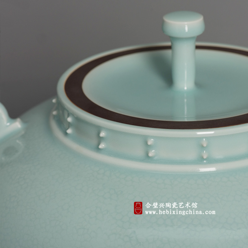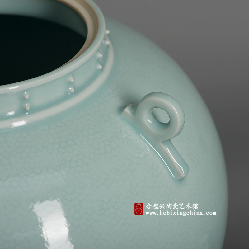 圆润饱满的罐身,清润似水的粉青釉还有细密精致的冰裂纹印花却温柔美好的如春日里的江南,山明水秀,暖风习习。