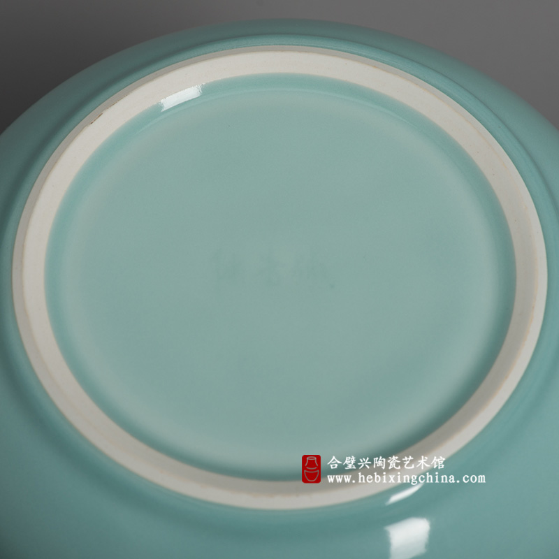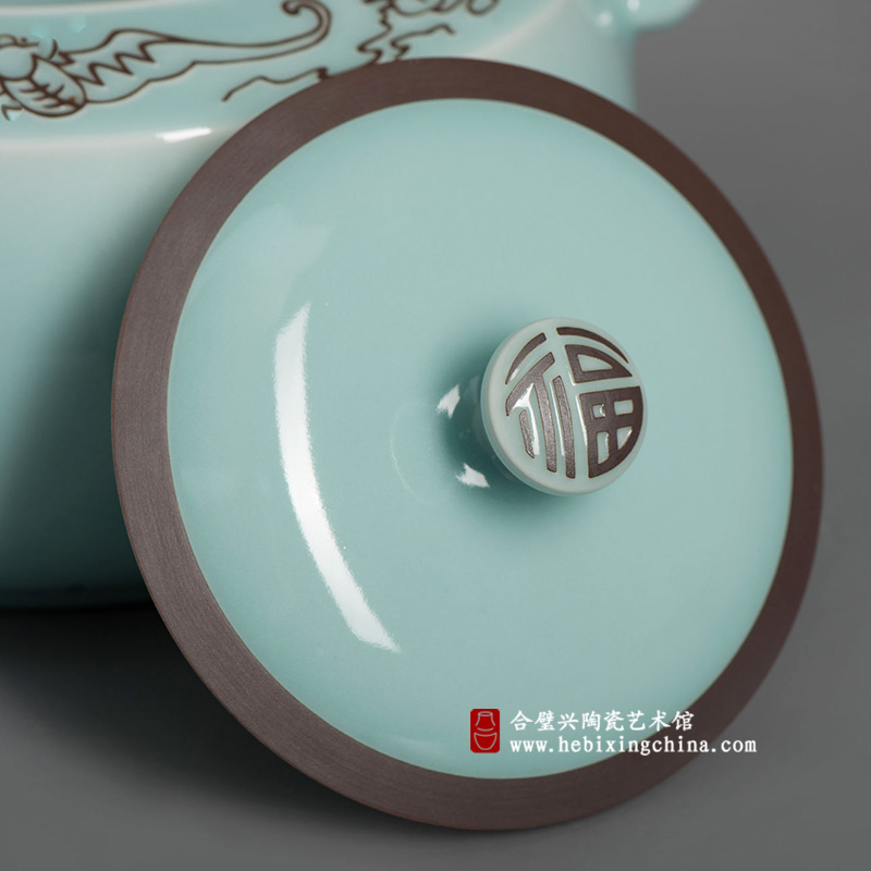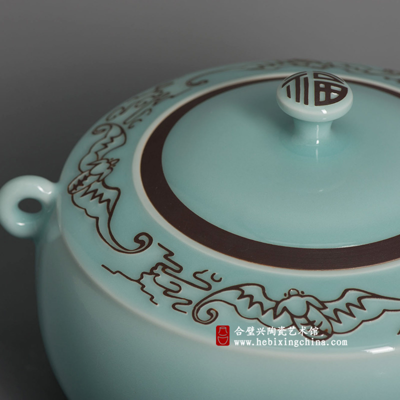 “蝠”与“福”同音,蝙蝠在人们眼中便成为了幸福吉祥的化身,陈善林老师让五只蝙蝠将盖钮上的圆润福字团团围绕,把“长寿、安乐、富贵、好德、多子”五福的美好寓意嵌入到作品中,让我们能在欣赏青瓷艺术的同时也能得到来自作者的美好祝福。