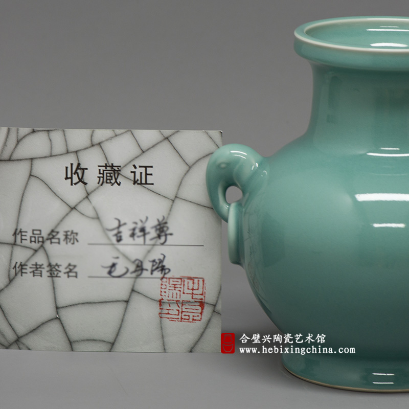 毛丹阳老师用梅子青釉平和温润之色与象耳瓶古朴吉祥之形的完美组合演绎出“太平有象”的吉祥寓意,可谓匠心独具。